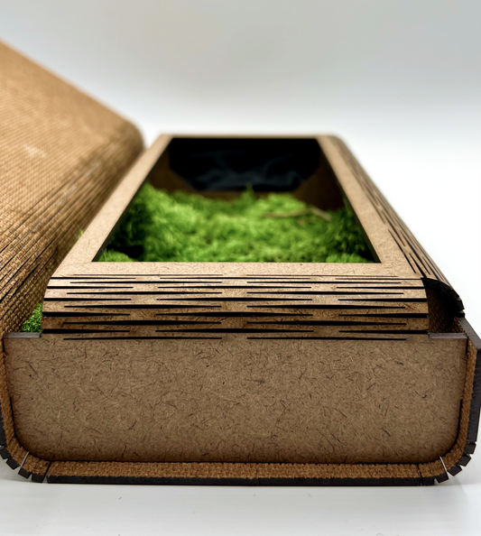 Uniek ontworpen kadoverpakkingen. Volledig organische case uit één stuk geperst eucalyptus hout. Gedroogd natuurlijk mos binnenin beschermd jouw WEARable.